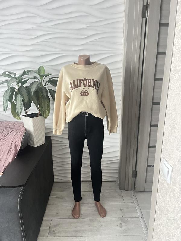 Світлий бежевий світшот вільного крою з круглою горловиною. Спереду принт “California USA” у коричневих тонах. Довгі рукави з манжетами, низ на еластичній резинці. М’який, комфортний та універсальний для повсякденних образів. Стан новий