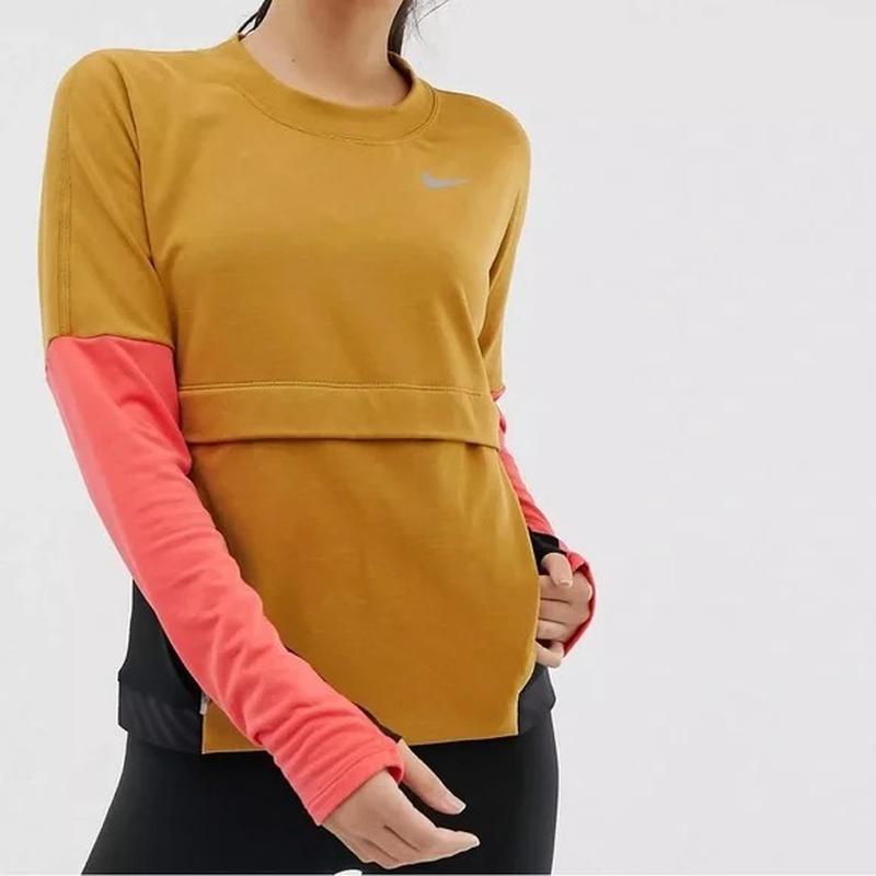 Спортивна жіноча термокофта Найк з круглим горловиною і контрастним дизайном, виконана в стилі ретро. Модель підтримує оптимальну температуру тіла, оскільки зшита з технологічної тканини Therma Sphere. Ця тканина має стільникову структуру, тому добре утримує тепло і активно відводить вологу. Кофта має вільний крій, що забезпечує максимальну свободу рухів. Спереду кишеня «кенгуру» на блискавці для зберігання дрібниць. Манжети з отворами для великих пальців виключають підстрибування рукавів під час виконання інтенсивних вправ. Світловідбиваючі елементи для безпечних тренувань у темний час доби. Розмір М орієнтуйтеся по замірам Стан нова без паперової бірки Обхват грудей 105,довжина рукава від коміра 75,довжина по спині 56