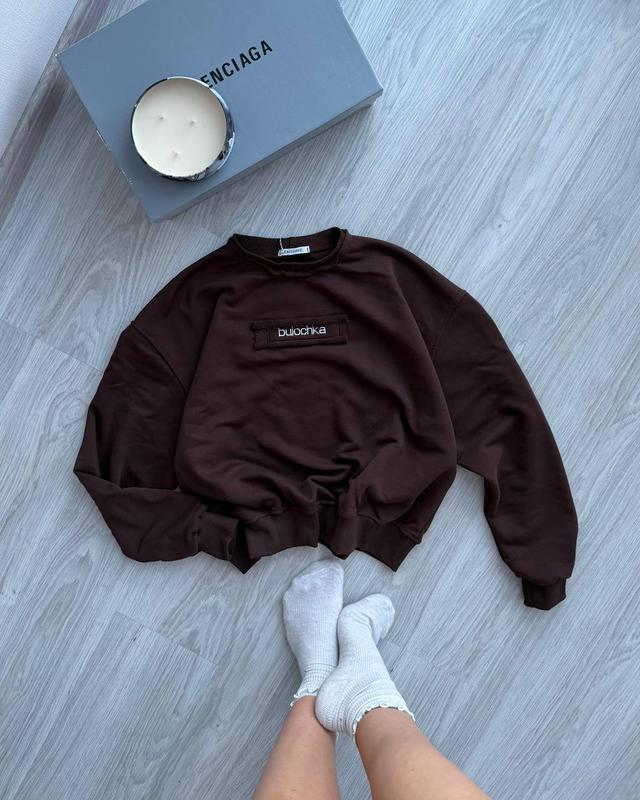 💕 Bulochka 💕 Світшот Код 386 🔹Тканина: петля Туреччина 🔹Колір: шоколад 🔹Розмір: 42/46 one size ❗️Якісна тканина яка не кашлатиться та не втрачає колір. На рукавах, горловині та низ світшота виконаний з рибана кашкорсе. Лаконічний дизайн з написом “Bulochka” на грудях додає елементи сучасного вуличного стилю та допомагає виразити індивідуальність. Реал фото 🔥