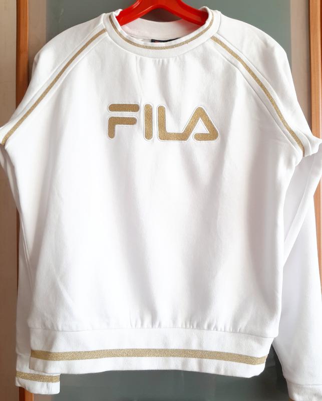 Білий світшот від бренду Fila з вишитим золотистим логотипом та блискучими вставками на плечах, манжетах і подолі. Без бірки, не носили. Довжина 56см, пог 52см, рукав 68см.