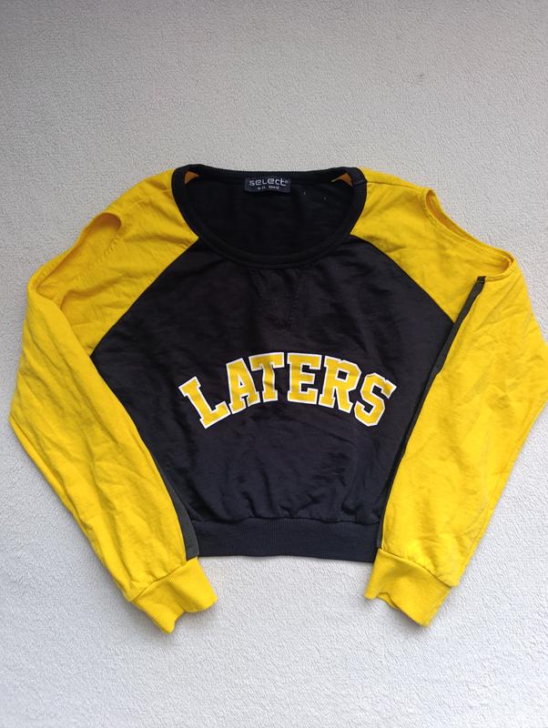 Це чорно-жовтий вкорочений світшот від бренду Select з принтом "LATERS". Плечі 36, груди 51, рукав 53, довжина по спині 41.