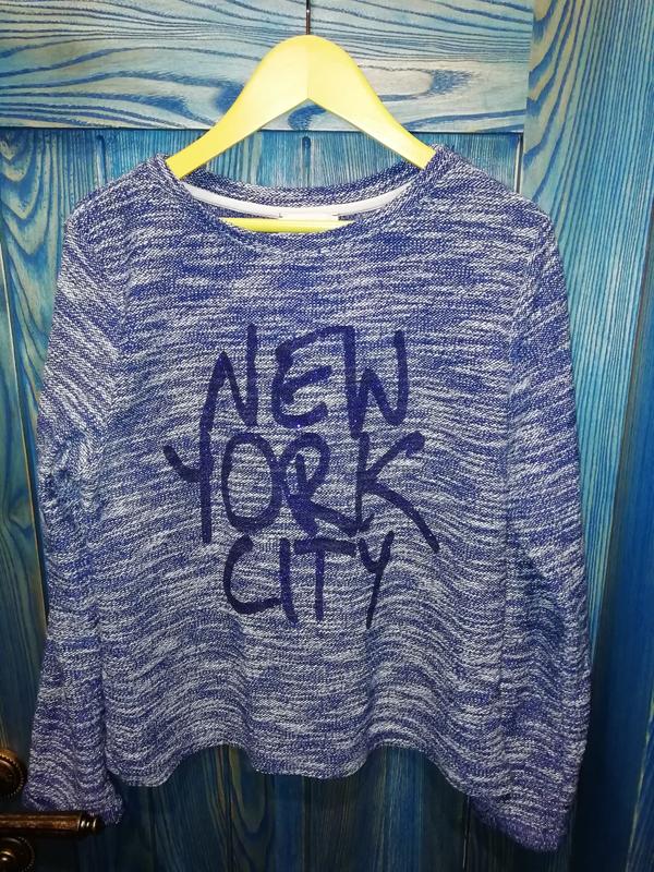 В стані нового класна кофточка, синьо-біла, напис/літери з блискітками. Довжина по спинці 55 Рукав від плеча 54 Може носиться, як укорочений варіант на дорослого, або як звичайний, якщо на підлітка. Класно виглядає з джинсами а-ля мамс або бойфренди. І до спідниці теж добре. Дефектів ніяких немає. Розвантажують шафа.