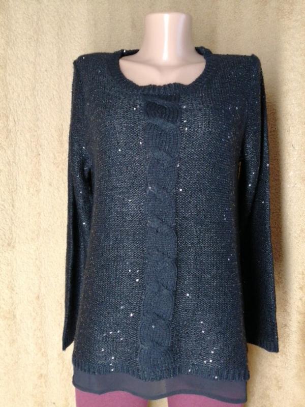 Чёрная кофточка с паетками по всей кофте. Спереди косичка, внизу подкладка. Смотреться шикарно ю. Синус: слегка колется, но привыкнуть можно))