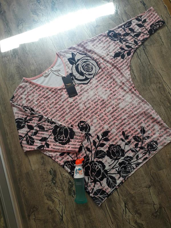 Нова якісна кофточка 💥🍒 відмінної якості! Рукав реглан. Аплікація стрази тримається дуже міцно. Тканина не втрачає форму! Пог 66 тягнеться 77см рукав від горловини 59см. Побіди 50 +++тягнеться. Довжина 71см.