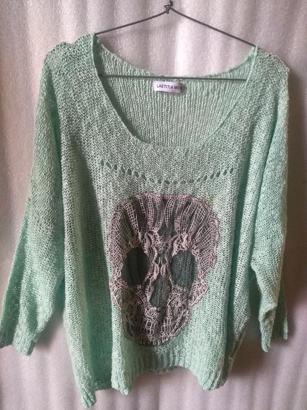 Светр дуже хорошої якості, оверсайз, біля черепа є плямочка, прати не пробувала думаю відійде, підійде на рр, від М до Хl, звужений рукав, робиться як три чверті, плечі 40см, груди 67см, довжина 64см, з безпечної оплатою працюю тільки по передоплаті 120грн, у разі повернення посилки це доставка в обидві сторони