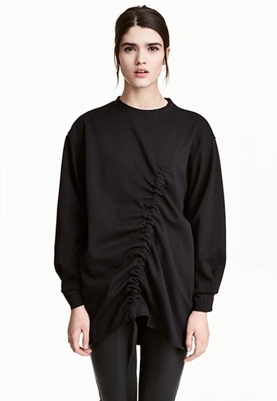 світшот з куліскою від бренду H&M розм. 32 № ********** Мірки: плечі 49см, пог 52см, довжина 73см, рукав 48см Довгий джемпер з нетканого футера. По діагоналі на джемпері куліска, а також фігурний рукав довжиною три чверті з зашитими складками. Еластичні манжети. Склад: 55% поліамід, 44% бавовна, 1% еластан Вигляд товару: з бірками