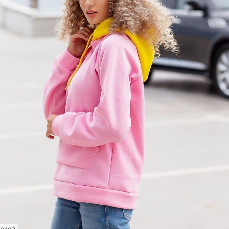 Світшот FZ-0405 455 Розміри: 42-46 Тканина трехнитка Кольори - рожевий+жовтий,блакитний+рожевий,білий+блакитний Тепле худі, з подвійним капюшоном,зручним кишенею кенгуру. ----------------------------------------