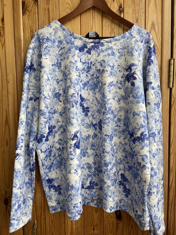 Шикарний світшот. Розмір вказано uk 22( eur 50). Добре буде і на наш 52-54. Тканина дуже приємна до тіла і не парить, не дивлячись на склад. Плечі 77 (носили спущеними) Пахви 73 Довжина 71 прямий Крій