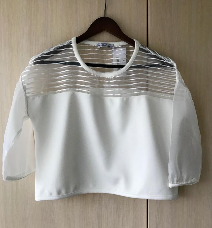 Бренд PULL&BEAR Удобная модель свитшота с шифоновыми вставками на плечах и шифоновым рукавом. Красивый шелковистый материал - дайвинг, плотный, отлично держит форму, шифон украшен перламутровыми полосками. Свитшот укороченный, рукав 3/4. Цвет молочный, ivory. Размер в наличии L Замеры размер L: ПОГ 57-58, ПО по нижнему краю 60, длина по спинке 52, длина рукава 34, плечо 19, пройма 18,5 Состав: 95% polyester, 5% elastane Доставка: Предоплата на карту Приват банка. Наложенный платеж НП с авансом. Отправка Новой почтой, Укр почтой, почтой Justin, Meest