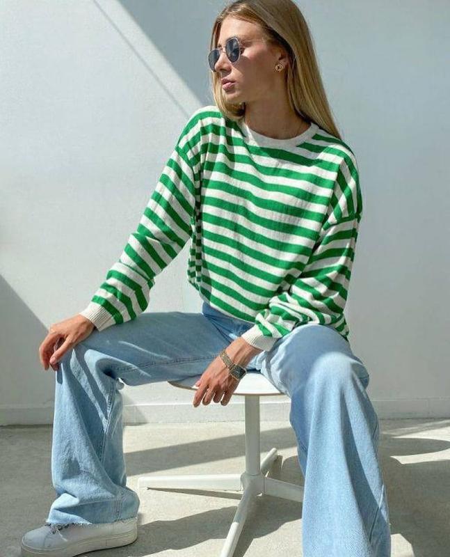 Тільняшка оверсайз в смужку арт. bot. 3310 Практичність затишного свитшота не порівняти ні з чим. Це ідеальна база для створення повсякденних, прогулянкових і спортивних образів в прохолодні дні. Цікавий свишот має оверсайз фасон. Особлива декоративна деталь цієї моделі – горизонтальні смужки. Поділ і манжети прикрашені широкою гумкою чітко в тон до свитшоту. Розмір: універсал Ціна : 700 грн Колір: зелена смужка Склад: 80% бавовна, 20% lycra Виробник Туреччина