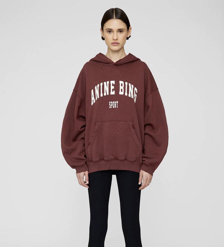Самая продаваемая толстовка Harvey – это объемная толстовка из 100 % органического хлопкового флиса, обновленная в этом сезоне темно-вишневого цвета. Он украшен трафаретной печатью ANINE BING Sport на груди с университетскими надписями цвета слоновой кости и тонкой шлифовкой по краям капюшона, манжет на рукавах и поясе, создавая винтажный образ. Включает функциональный передний карман-кенгуру.