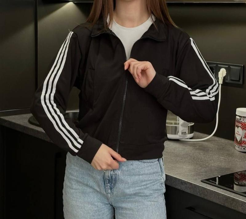 Стильна укорочена кофтинка з лампасами та плечиками. Є бокові кармашки. Якість відмінна. Тканина: двохнитка. Колір: чорний. Розмір: 42/46 (one size).
