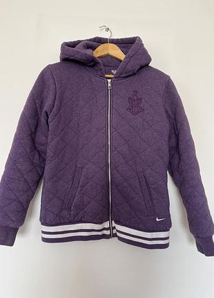 Куртка спортивного стилю, стьобана, з капюшоном та білими смугами на манжетах та подолі. Має застібку-блискавку по всій довжині Заміри довжина рукава 60см з манжетами Довжина виробу 63 з манжетом Пог -47см