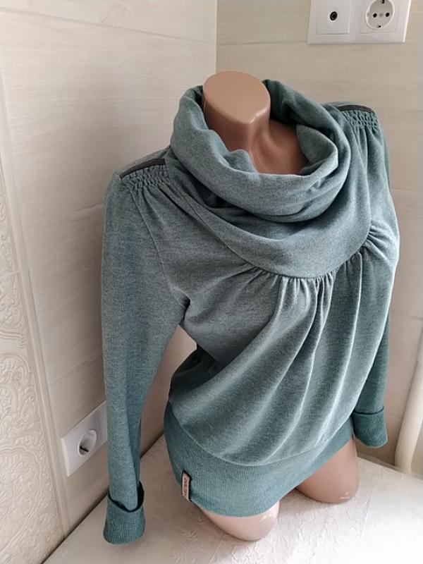 Прекрасна кофта толстовка Naketano розмір M - L Склад : коттон 75 %, поліестр 25 % Нижня частина кофти і низ рукавів - щільна в'язка- "резинкою" Колір морської хвилі ( середнє між першими трьома знімками) Річ чиста, без запаху Довжина 57 см ПОГ (відстань між пахвами) 50 см Довжина рукава 63 см, на фото з подвернутым рукавом 55 см