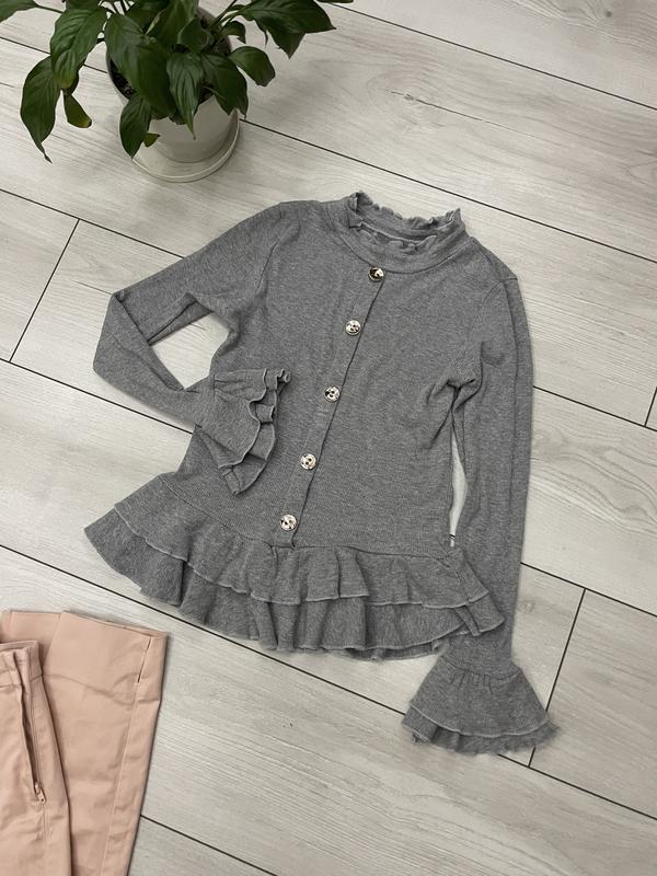 Кофта-гольф серого цвета в мелкой рубчик. Красивые воланы по рукавам, низу гольфа и вместо воротничка придают нежность образу. Пуговицы для декора. Ткань приятная и нежная на ощупь.