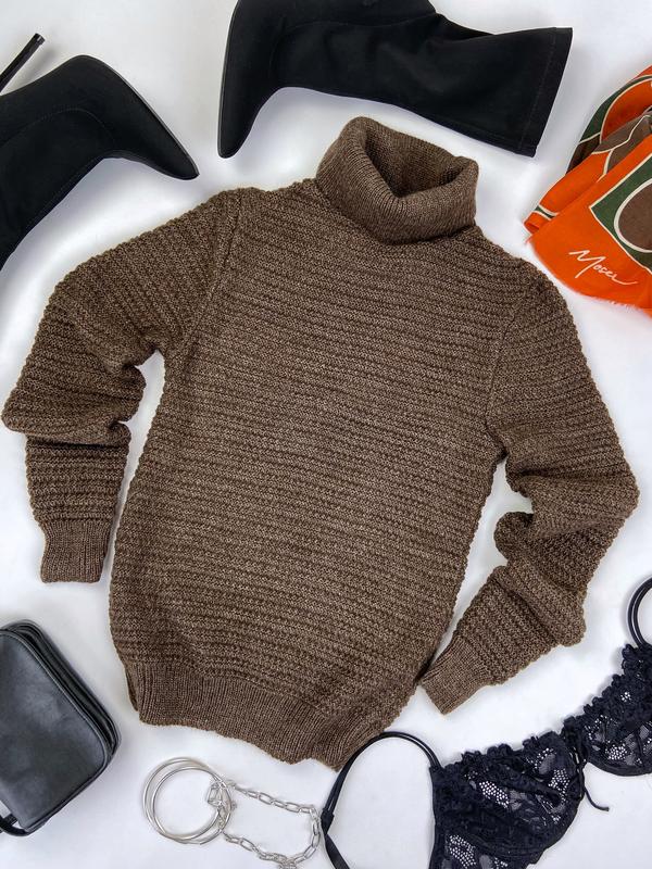 Светр-гольф дуже еластичний, колір шоколад, звʼязаний обʼємною гумкою і сідає ідеально по фігурі, склад 50вовна/50акрил, не кошлатиться, після прання не деформується, в одному розмірі - сідає на 42-48 (XS-L), заміри в найменшому стані: ширина 37см, довжина 58см, довжина рукава 68см Є інші кольори, дивіться на моїй сторінці
