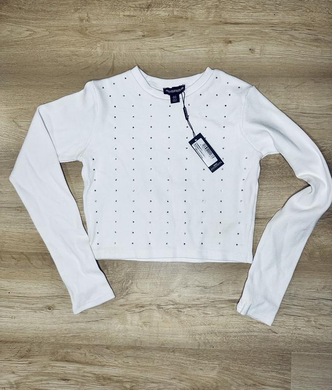 Кофта біла з стразами, вкорочена кофта в мілкий рубчик, спереду повністю в стразах. Нова, з бірками та етикетками. Вказано розмір S, але краще сяде на розмір XS. В наявності, відправки щодня