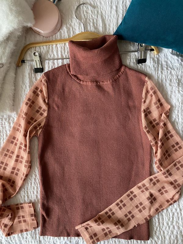 Стильний жіночий гольф от Zara. Основна частина виготовлена з ребристого трикотажу теракотового кольору, рукава — легкі, з оригінальним геометричним принтом у вигляді клітин. Модель має високий комір-стійку, який додає елегантності. Підійде як для повсякденного носіння, так і для більш офіційних зустрічей. Стан: ідеальний💕