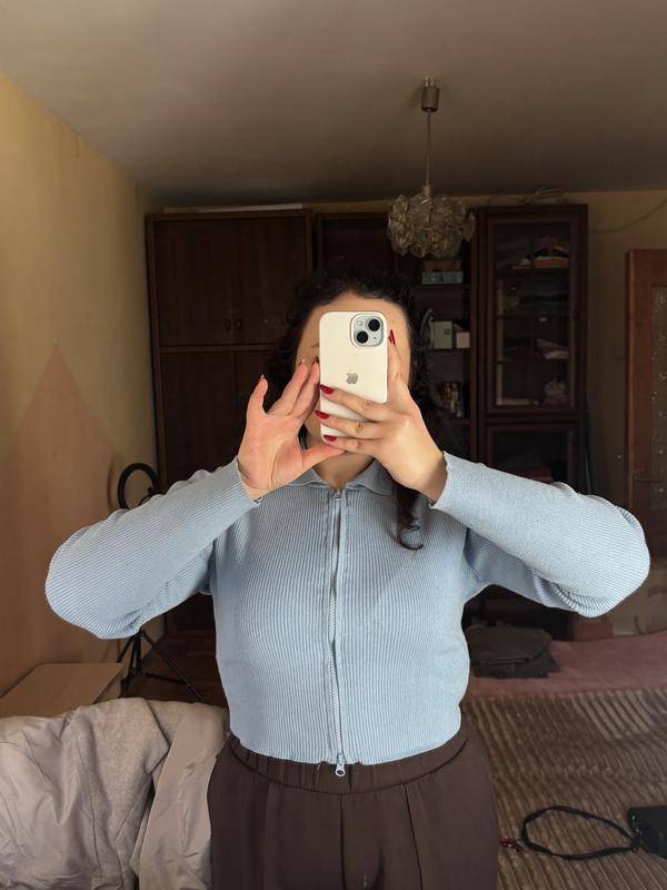 Блакитна кофтинка в рубчик, вкорочена на замочку.Розмір L, добре тягнеться