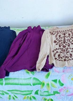 Все продається одним лотом (дві водолазки гольфи, фліска, кофточка і лосінки). З нюансів - малиновий гольф трішки розтягнутий, під руками світліше, линяє... синій гольф - знизу нитки місцями повитаскані... фліска має нюанс - електризується і притягує все до себе🤭 світла кофтинка має місцями катишки... лосінки - розтягнуті трішки, зашиті, мають сліди від червоної фарби і білі (декілька цяток). Носилися кофтинки на обхват грудей - 94, на обхват стегон 98-102.