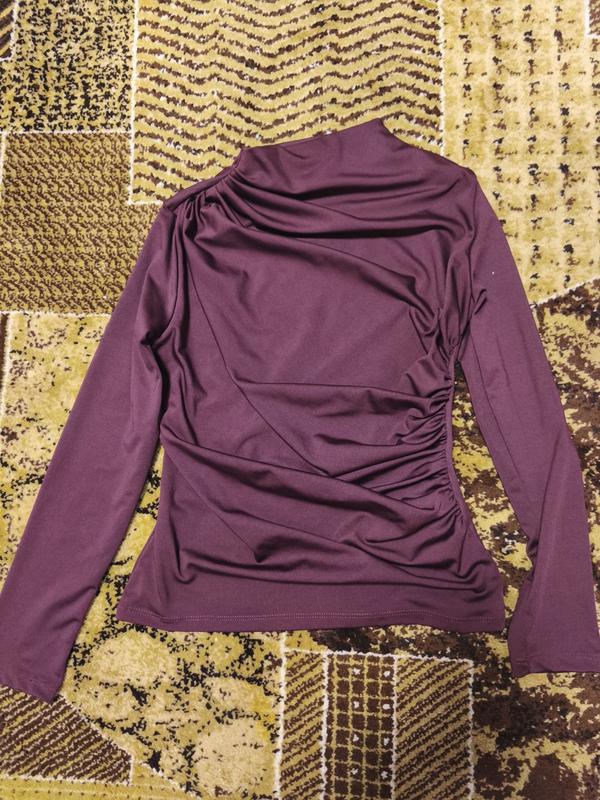 Жіночій гольф в кольорі бургунді ( бордо) та драпіруванням з боку. заміри в пів обхвату: плечі 36 см під пахвами 46 тягнится до 65 см. Довжина рукава від плеча 59 см. Довжина гольфа від плеча 58 см.