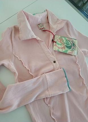 100% котон,вставки прогумованого трикотажу,тягнеться.Оверлок на рукавах і знизу виконаний бірюзовою ниткою.Нова,без нюансів.Приємний рожевий колір.