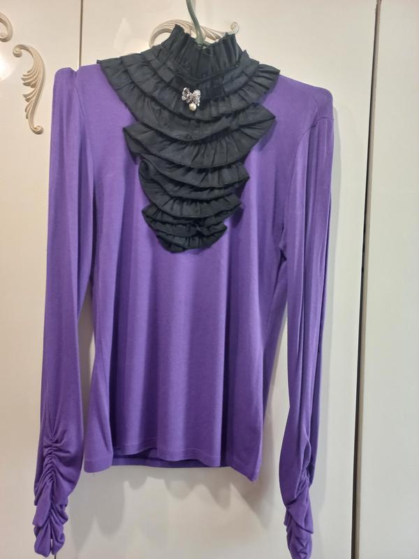 Красива фіолетова блуза з жабо. Реальний колір переданий на фото 1. Тягнеться. Оздоба у комплекті не йде. Заміри живіть, надішлю.