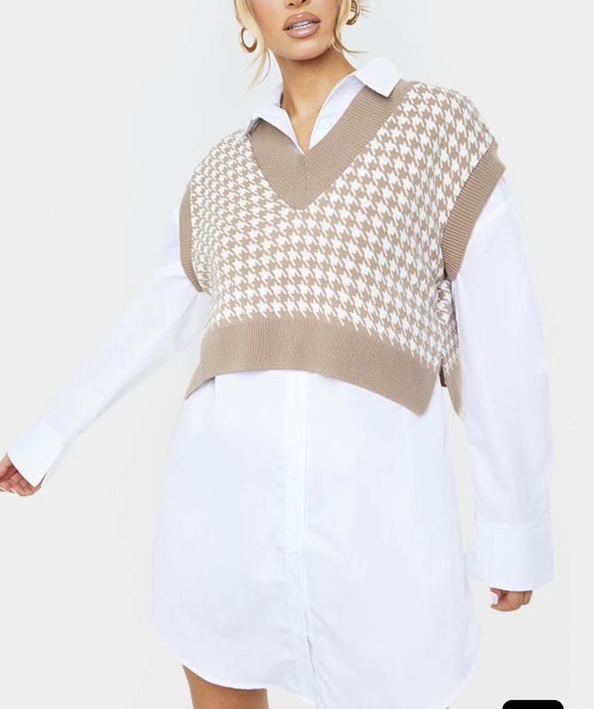 Укорочена жилетка з V-подібним вирізом у клітку, принт гусина лапка Стан: ідеал! Pretty little thing Розмір L. Добре сидить як оверсайз на С-М. Довжина 42 см Пог 52 см Плечі 55 см спущені 100% акрил Поєднуйте світлі витерті джинси та сумку через плече, щоб створити атмосферу невимушеного шику