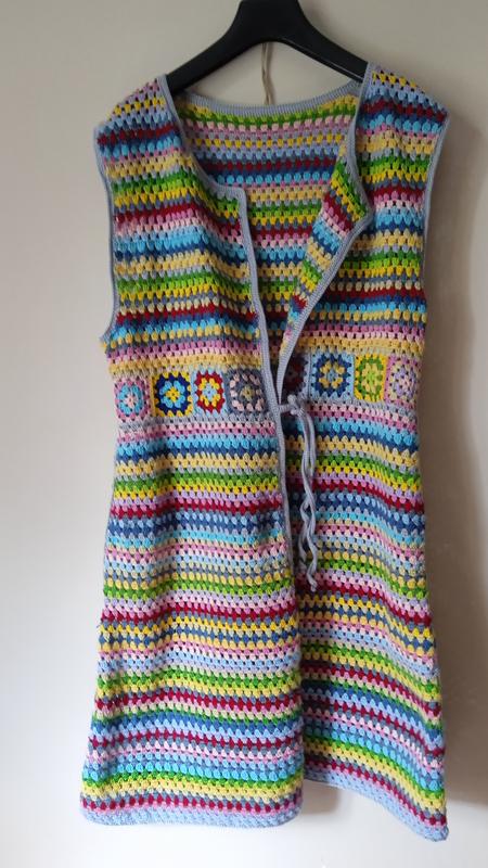 Жіночий подовжений жилет,плетений гачком з бавовняних ниток різних кольорів.Довжина -88см. , висота пройми-24 мм. , ПОГ-44см.