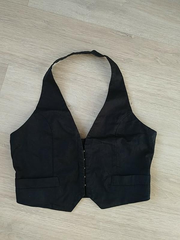 Приталений жилет з відкритою спиною,застібається на. крючечки.Кармани обманки.Стан новий,не одягався ні разу
