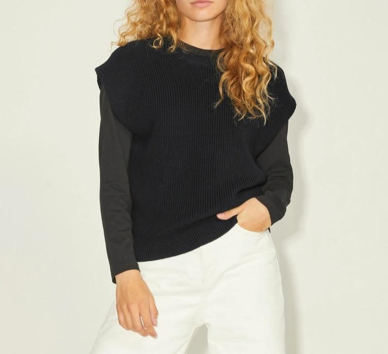 В'язаний жилет в розмірі ХС,С,ХЛ. Колір темно синій ХС довжина 59 пог 46; Темно синій С довжина 61, пог 50; Колір коричневий ХЛ довжина 64, пог 64.