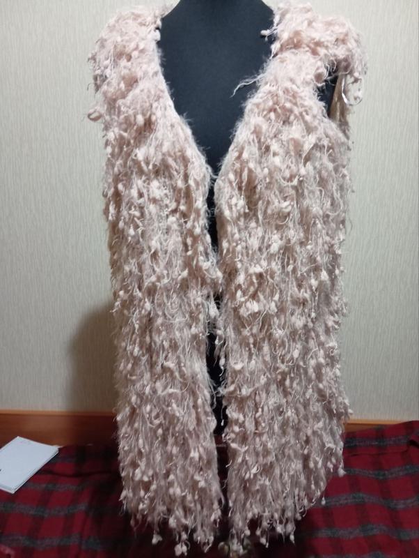 В'язана жилетка неймовірного персикового кольору , Довжина по спинці -70см. Ширина-55см в не розтягнутому стані. По бірці розмір S /M, хоча можна й на L. Колір насправді більш насичений ніж на фото.
