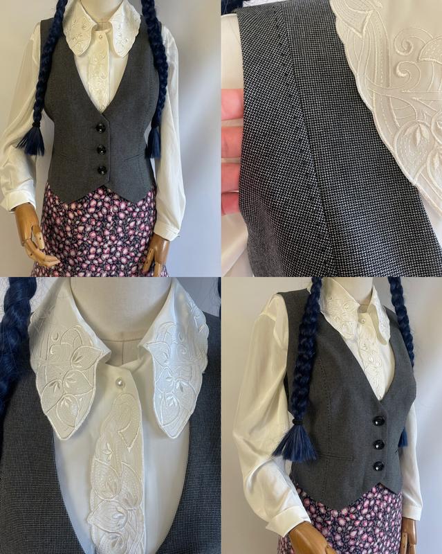 Вінтажна приталена жилетка сірого кольору на ґудзиках, йде на підкладці. Має красивий та глибокий виріз, чудово підійде для образів з краваткою. Розмір 44/46, заміри: ПОГ 53/55 см + виточки ПОТ 46 см довжина по спинці 50 см Опис блузи⤵️ Вінтажна молочного кольору блуза з ніжною вишивкою на планці та комірці від CANDA. По всій довжині ґудзики, першу перлину помітно, а інші ґудзики знаходяться за планкою. Розмір 40 Заміри: ПОГ 55 см плечі 42 см рукав 60 см довжина 65 см Ціна: 585 грн, відмінний стан