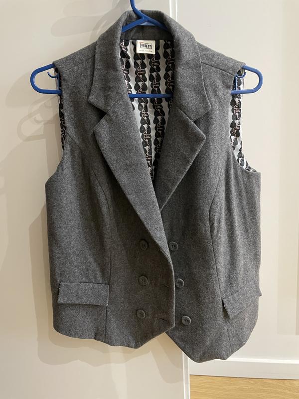 Отличная винтажная жилетка из шерсти и атласа. Цвет серый, короткий крой. Размер L по размерной сетке, но она небольшая, подойдет и на М и на S