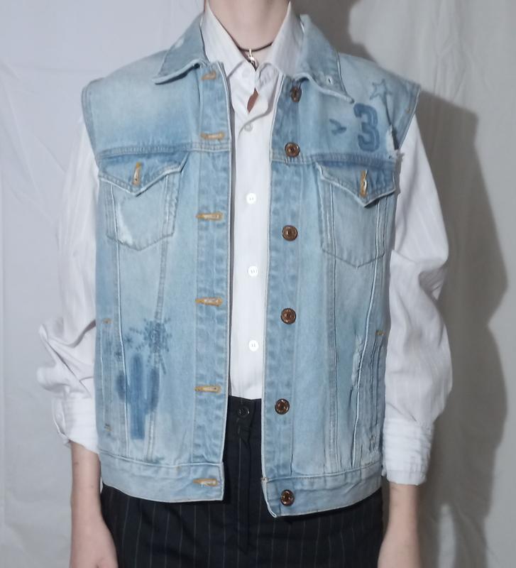 джинсовий жилет жіночий з принтом. Має дві кишені спереду, комірець з потертостями. Застібається на 6 металевих ґудзиків спереду. Розмір М. Параметри моделі: 88-65-82, зріст 172см