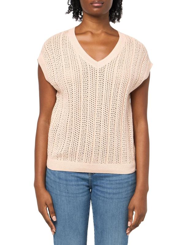 В'язаний жилет DKNY. Стильний і приємний до тіла в'язаний жилет із люрексом. V-подібний виріз. Горловина, пройми для рук і поділ еластичні та в рубчик. На подолі текстильна нашивка з логотипом бренда. Цей жилет можна носити як самостійно деталь, так і як верхній шар. Чудова якість. Розміри: XL У Києві самовиїзд і примірювання можливе в робочі дні з 9.30 до 18.00. У невеликому та затишному шоу допоможемо підібрати Вам саме те, що потрібно! Відсилання Новою Поштою і Укрпошта щодня. Доступний накладний платіж без передоплату. Кур'єрська доставка по Києві.