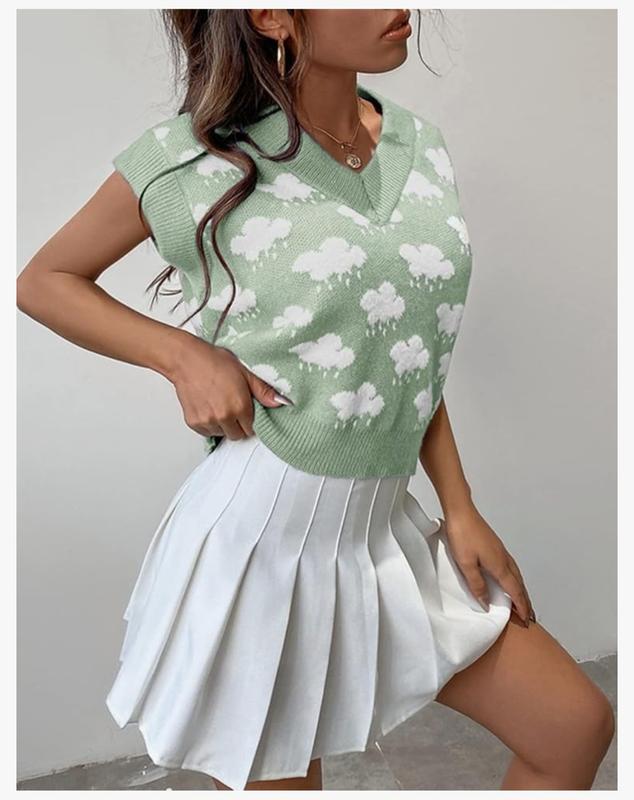 Жіночий светр з v-подібним вирізом та хмарним принтом, в'язаний светр,безрукавка вільного...