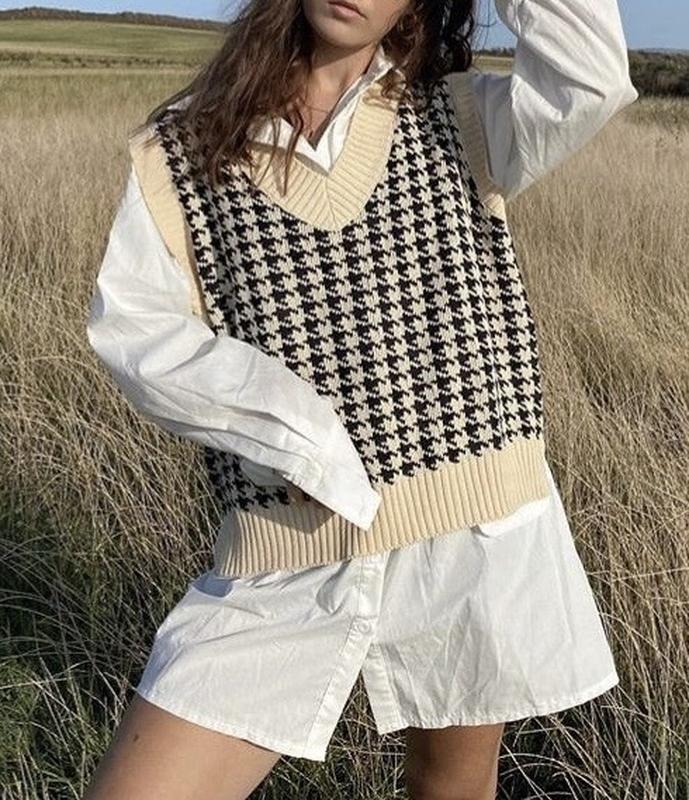 Трикотажна жилетка Zara з візерунком «гусяча лапка» у чорному та білому кольорах. Розмір М, але завдяки вільному крою гарно сяде і на S (буде більш оверсайз) та на L (посадка щільніша). Ідеально виглядає з сорочкою чи футболкою ⚠️ Є невеликий дефект – маленька плямка на воротнику (видно на 5-му фото).
