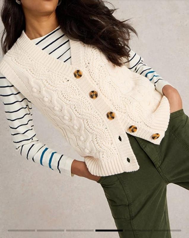 Предлагаю красивый жилет с содержанием шерсти от white stuff. Вещь совершенно новая, только без бумажной бирки. Цвет не чисто белый, а молочный. Приятный, мягкий, теплый, эластичный, в составе полиэстр и шерсть. Крой прямой, застегивается на пуговицы. На бирке размер 14, но ориентируйтесь на замеры. Замеры: грудь 50 до 58 тянется, по низу 48 и тянется, длина 60