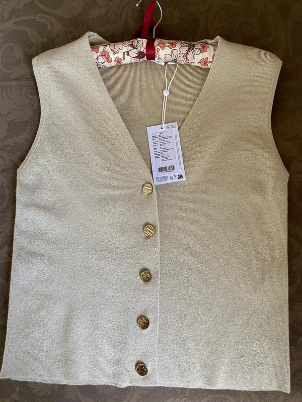 Жилет новий золотистий. ПОГ – 43см, Довжина – 53 см, плечі – 40см, плече – 10 см. М'яка тканина, але тримає форму. Можна як самостійну річ або зверху лонгсліву, водолазки. Розмір М можна S .