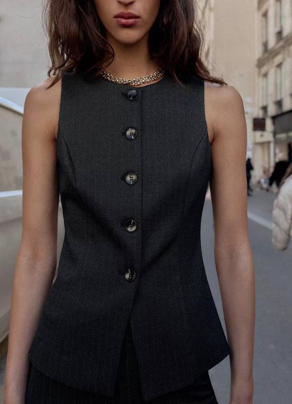 Жилет із круглим коміром без рукавів. Застібається спереду на ґудзики. ТЕМНО-СІРИЙ Розмір XS