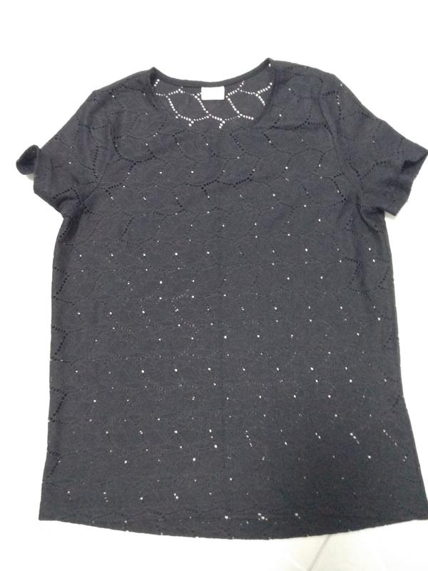 футболка гіпюр трикотаж. Ширина в плечах 34 см пів'обєм в грудях 46 см пів'обєм в талії 46 см пів'обєм понизу 48 см довжина перед 61 см зад 63 см.