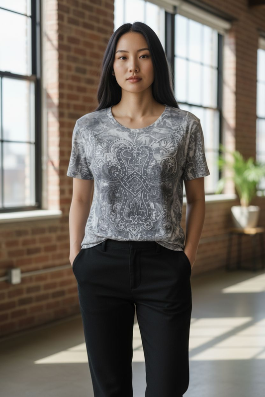 306.чудова футболка в принт з декором популяроного італійського бренду max mara