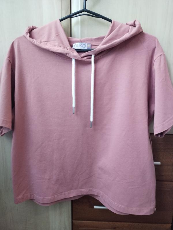 Жіноча коротка футболка з капюшоном. Довжина 47 см, ширина на рівні грудей 53 см. Середньої щільності, нетонка. Колір брудно-рожевий, пудровий, не яскравий