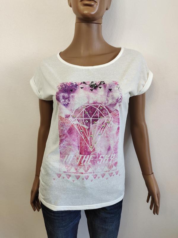 Вишукана жіноча футболка відомого бренду Cache Cache. Білого кольору з яскравим принтом та пайєтками. Див фото. Зручна та гарно дивиться! Легка та приємна до тіла. Добре тягнеться! Матеріал: 95% поліестер, 5% бавовна. Виробник Острів Маврикій. Заміри (р.S/M): - пів об’єм грудей (під пахвами): 46см - довжина рукава: 16,5см (від горловини) - довжина по спині: 62см - по талії (ширина): 39см - низ: 44см. ВАЖЛИВО! Порівнюйте заміри зі своїми речами, в яких Вам зручно! Деякі речі можуть більшемірити чи меншемірити! Відправка Новою поштою (оплата на карту чи накладним платежем (при мінімальній передоплаті). Укрпоштою при повній оплаті. Дивіться також мої інші оголошення. Щоб не загубити, додайте у «обране». Підписуйтесь на постійне оновлення та додавання нових позицій.