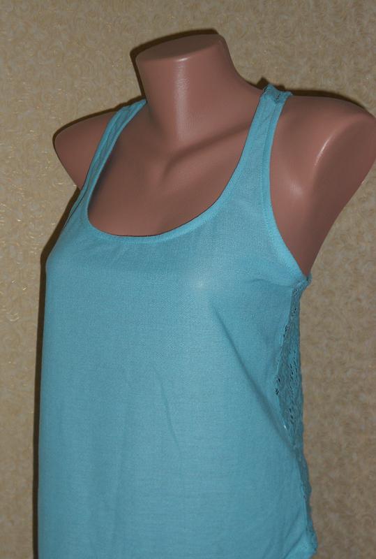 Літня футболка бірюзового кольору. З оригінальною гіпюрової вставкою на спині. Стан нової речі. р. S. Всі виміри за запитом. Відповім на всі питання.