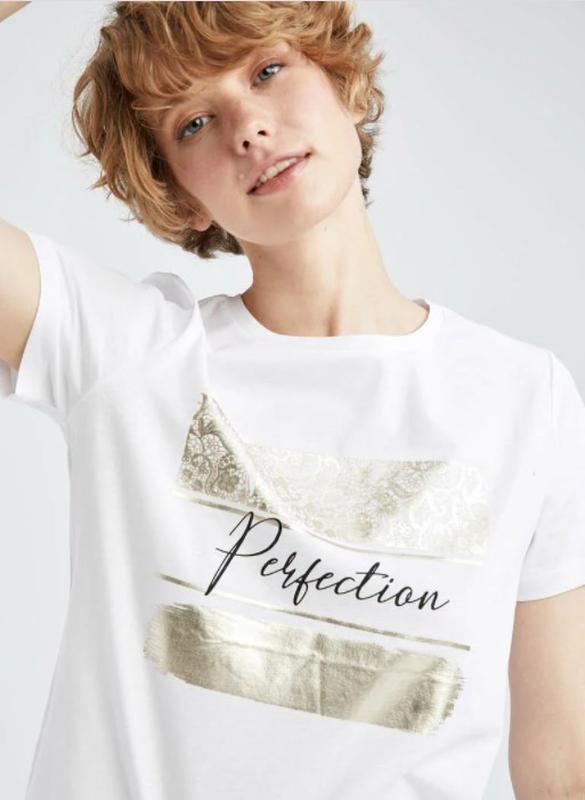 Біла жіноча футболка defacto / дефакто з написом perfection і ажурним принтом