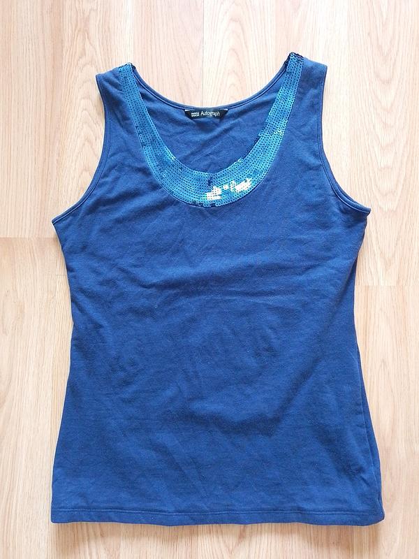 Майка в дуже гарному стані. Коттон 95% зверху. Заміри зроблено зсередини бо майка на підкладці Довжина 57 см Напівобхват грудей 39,5 см тягнеться до 44 см Талія напівобхват 27 см тягнеться до 31 см максимально Низ 39 см Розмір вказано 12, краще по замірах орієнтуватися.