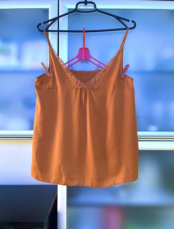 M&S collection нова дууже красива маєчка. Стильна виглядає під жакет. Тканина схожа на шовк, красивий, насичений колір-кірпич. Розмір з бірки 12/40. Довжина 63 см. Брітелі регулюють довжину. Напів обхват грудей 43 см, тягнеться до 50 см (по спині резинка). Поліестер.