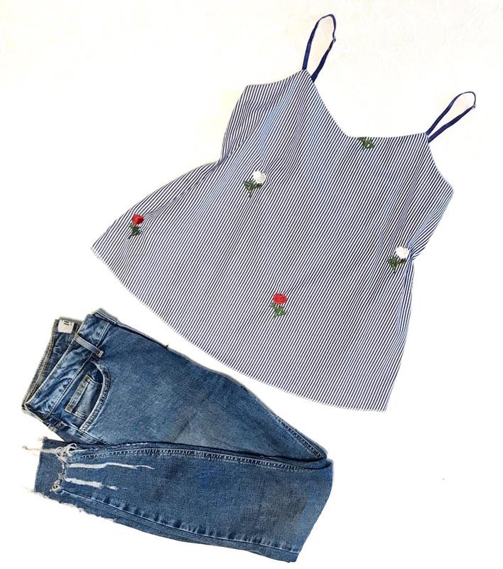 Легка натуральна майка топ в синьо-білу смужку з квітковою вишивкою Quiz, розмір 38.